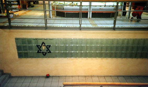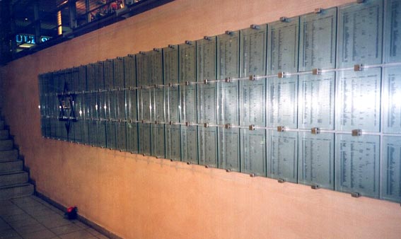 gepflegte Blumenstände, und auf dem unteren Treppenabsatz ist eine gläserne Gedenktafel