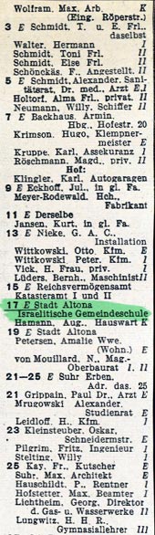 Aber wo ist Nummer 17? Weisst Du, dass ich meiner Lehrerin in der ersten Klasse sagte, dass P mein Lieblinsbuchstabe ist? P ist nämlich der Anfang von Palmaille und Papagoyenstrasse, wo die Schule, die "Schul" (Synagoge) und mein Zuhause waren. Damals lächelte meine Lehrerin ein lobendes, ermunterndes, leises Lächeln. Ob auch ihr da lächelt? Es ist mir, als wolltet ihr mich drängeln: So gehe doch in die Palmaille, die Palmaille gibt es ja noch! Keine "Terrorbombe" hat während des Krieges das Schulgebäude getroffen und zerstört. Aber wo ist Nummer 17? |