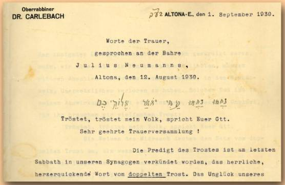 Und dann ertönte der Nachruf von Oberrabbiner Dr. Joseph Carlebach mit dem biblischen Doppelruf: „Tröstet, tröstet mein Volk!“ (gemäß Jesaja 60,1)